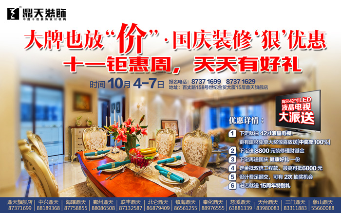 1.下定就抽42寸液晶電視,更有建材免單大獎驚喜放送【中獎率100%】; 2.下定就送8800元裝修理財基金一份; 3.下定再送國慶健康好禮一份; 4.定金抵雙倍抵工程款,最高可抵6000元; 5.設(shè)計費足額交,可有2次抽獎機會; 6.進店就送15周年特別禮1份; 時間:10月4日—7日 報名電話:87371699 地址:寧波百丈路158號世紀(jì)金貿(mào)大廈15層鼎天裝飾旗艦店