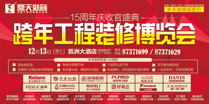 裝修“抄底”在年終;年終“抄底”當(dāng)擇鼎天裝飾跨年裝修博覽會(huì);如果這場活動(dòng)正又巧是鼎天裝飾15周年慶收官盛會(huì),那就更是“抄底”中的“抄底”。12月13日(周六),鼎天裝飾15周年慶收官盛典之2014跨年裝修博覽會(huì)強(qiáng)勢來襲。如果您想要裝修裝得漂亮、裝得省錢、裝得安心,那就一定要抽個(gè)時(shí)間來凱洲大酒店四樓嘉洲廳參加這場家裝盛會(huì)。到訪就有禮哦! 鼎天“跨年裝修”說:五大利 一利,規(guī)避高峰,細(xì)工出精品:一到年底,公司往往進(jìn)入休整期,這個(gè)時(shí)間段,設(shè)計(jì)師和施工師傅會(huì)相對空閑,加之客戶不急于入住,利于細(xì)工出精品。 二利,跨年施工好處多:如冬季氣候干燥,空氣濕度最小,年前做完水電、泥工、木工等基礎(chǔ)工程,春節(jié)長假歇工半個(gè)月后,新砌墻、現(xiàn)澆樓板、線槽封蓋等都會(huì)充分晾干,對防止開裂、發(fā)霉等問題十分有利。 三利,裝修省錢大招:裝修建材、人工費(fèi)一年一個(gè)價(jià),最近幾年更是年年有所上漲,跨年裝修有利避免年后漲價(jià)風(fēng)波。 四利,上規(guī)模的品牌家裝公司,讓業(yè)主放心裝修。在這場跨年裝修活動(dòng)中,鼎天裝飾不僅安排了豪華設(shè)計(jì)師陣容,并推出“在裝工地體驗(yàn)”活動(dòng),開通百套實(shí)景樣板房直通車,讓業(yè)主們現(xiàn)場體驗(yàn)不同風(fēng)格、不同戶型、不同施工階段的裝修,聆聽設(shè)計(jì)師的設(shè)計(jì)講解,感受真實(shí)空間的設(shè)計(jì)元素布局,切實(shí)保障跨年裝修品質(zhì)。 五利,知名樓盤小區(qū)設(shè)計(jì)案例年終匯總發(fā)布?,F(xiàn)場將提供諸如青林灣、維科上院、鈺鼎園、蘇園、印象外灘、世茂首府、三水灣、悅瀾灣、星河國際、君瀾上府、榮安心居、鉑翠灣、東海府、集成廣場、紫玉花園、君雅苑、薛家新家園、金色瓏庭、東都華庭、光大江灣府第、金橋水岸、公元世家、南熙園、宜家花園、晴園、麗景英郡、保利城、永和居易、芳辰麗陽、華城花園、蝶園、IN藍(lán)庭、雷迪森廣場、英倫水岸、東湖觀邸、皇冠花園、盛世天城、江南一品、雍城世家、水岸楓情、BOBO城、風(fēng)格城事、上上城等甬城眾多中高端小區(qū)。 家裝建材聯(lián)盟,拿禮拿到手軟 本屆跨年家裝活動(dòng),鼎天裝飾將與一線品牌建材戰(zhàn)略聯(lián)盟,強(qiáng)勢力推“跨年裝修六大禮”:到訪禮、集章禮、連購禮、現(xiàn)金禮、簽單禮及免單大獎(jiǎng),品牌建材涵蓋瓷磚、地板、櫥柜、吊頂、衛(wèi)浴、窗簾等全部品類。 參加這場跨年家裝活動(dòng),肯定讓前來的業(yè)主們拿禮拿到手軟。進(jìn)入展廳,就先拿一份“見面禮”;集齊10枚紀(jì)念章還可再領(lǐng)取一份實(shí)物禮;現(xiàn)場下定,再享交定金返現(xiàn)金優(yōu)惠,即所謂現(xiàn)金派送禮;憑鼎天裝飾定單,還可參與砸金蛋得免單大獎(jiǎng),大獎(jiǎng)包含建材、家電、工程抵用款等心動(dòng)大獎(jiǎng)。此外,在活動(dòng)現(xiàn)場購買聯(lián)盟建材還享受聯(lián)購禮,根據(jù)聯(lián)購的建材品類數(shù)量,免費(fèi)收獲電飯煲、洗衣機(jī)、液晶電視等家電大禮。如此多重大禮,只有在年底收官之時(shí),才能暢享;也只有在鼎天裝飾跨年裝修博覽會(huì),才能遇上!惠民強(qiáng)襲,裝修還在等什么! 跨年裝修“省錢利器”美艷5號、8號精裝套餐 此次活動(dòng),鼎天美艷5號,以及針對都市白領(lǐng)、經(jīng)典婚房、大平層及改善型裝修的美艷8號精裝套餐,將聯(lián)袂“省錢”跨年裝修。 鼎天美艷5號精裝套餐專為15周年大慶特意打造,實(shí)景房已全面向裝修業(yè)主們開放,這套歷時(shí)半年規(guī)劃的作品,集合了鼎天至尊工作室強(qiáng)大的設(shè)計(jì)力量,以呈現(xiàn)當(dāng)代人居嶄新美學(xué)為目標(biāo),吸引了甬城眾多業(yè)主的目光。它在價(jià)格、設(shè)計(jì)、施工、建材品牌選用等環(huán)節(jié)上的精細(xì)規(guī)劃和精益求精,比常規(guī)裝修節(jié)省了400-500元/平方米費(fèi)用,而且它讓裝修更輕松、簡便,更讓人放心,即使再挑剔的裝修客也是見之欣喜。 特別預(yù)告: 12月13日(周六)9:00---17:00,鼎天裝飾在凱洲大酒店四樓嘉洲廳(天一廣場南面)舉辦“15周年慶收官盛典暨跨年裝修博覽會(huì)”,現(xiàn)場限量征集前100套鼎天15周年“感恩特惠”“跨年家裝”樣板房,并以成本價(jià)為其裝修,且由鼎天至尊工作室、金牌施工團(tuán)隊(duì)聯(lián)手打造完美家裝樣板工程?,F(xiàn)場還尊享一站式家裝建材購齊服務(wù),優(yōu)惠史無前例! 樣板房報(bào)名熱線:87371629 貴賓熱線:87371699