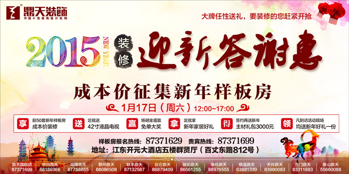 新年裝修,大牌家裝公司會(huì)有怎樣的“任性”表現(xiàn)?鼎天裝飾2015裝修迎新答謝惠,大牌任性送禮,要裝修的您趕緊開搶! 大牌“任性”饋禮多 1月17日(周六),鼎天裝飾在寧波江東開元大酒店五樓群賢廳舉辦“2015裝修迎新答謝惠”,現(xiàn)場任性送禮。迎新答謝,鼎天裝飾向全甬城待裝修客戶發(fā)出50套新年樣板房征集令,以成本價(jià)為其裝修;活動(dòng)中,客戶下定金,除了抱42寸LED液晶電視回家,還可拎走一份新年家居好禮;同時(shí)現(xiàn)場還可砸金蛋贏各種免單大獎(jiǎng)。 “任性”就此結(jié)束?還沒呢,下單客戶還能再享3000元新年主材禮包,這3000元可以購買,瓷磚、地板、櫥柜、窗簾等。所有來到迎新答謝惠的客戶,都可以拿到一份精心準(zhǔn)備的新年禮物哦! 迎新家裝送品質(zhì) 這場裝修迎新答謝惠,鼎天裝飾不光送上大禮,還要送上品質(zhì),送上貼心服務(wù)。 活動(dòng)中,鼎天裝飾攜“至尊工作室”豪華設(shè)計(jì)師陣容亮相,并推出“在裝工地體驗(yàn)”活動(dòng)。開通百套實(shí)景樣板房直通車,讓業(yè)主們現(xiàn)場體驗(yàn)不同風(fēng)格、不同戶型、不同施工階段的裝修,聆聽設(shè)計(jì)師的設(shè)計(jì)講解,感受真實(shí)空間的設(shè)計(jì)元素布局。這樣的實(shí)力,絕對(duì)保障您的家裝在設(shè)計(jì)、工程上的品質(zhì)。 現(xiàn)場,業(yè)主們還可品鑒鼎天裝飾在諸多知名小區(qū)中打造的數(shù)千套優(yōu)秀案例,如青林灣、維科上院、鈺鼎園、蘇園、印象外灘、星河國際、君瀾上府、榮安心居、中海凱旋門、鉑翠灣、東海府、集成廣場、紫玉花園、君雅苑、金色瓏庭、東都華庭、光大江灣府第、金橋水岸、公元世家、南熙園、宜家花園、晴園、麗景英郡、保利城、永和居易、芳辰麗陽、華城花園、蝶園、IN藍(lán)庭、雷迪森廣場、英倫水岸、東湖觀邸、皇冠花園、盛世天城、江南一品、雍城世家、水岸楓情、BOBO城、風(fēng)格城事、上上城等。大牌就是這么有底氣! 同時(shí),還有鼎天美艷5號(hào)、美艷8號(hào)精裝套餐作品,也將聯(lián)袂為您送上新春祝?!铝轲菢I(yè)主打造省錢、省心、省力裝修! 特別預(yù)告: 1月17日(周六)12:00---17:00,鼎天裝飾在寧波江東開元大酒店(百丈東路812號(hào))五樓群賢廳舉辦“2015裝修迎新答謝惠”,現(xiàn)場限量征集前50套“新年特惠”樣板房,以成本價(jià)為其裝修,且由鼎天至尊工作室、金牌施工團(tuán)隊(duì)聯(lián)手打造完美家裝樣板工程。 樣板房報(bào)名熱線:87371629 貴賓熱線:87371699