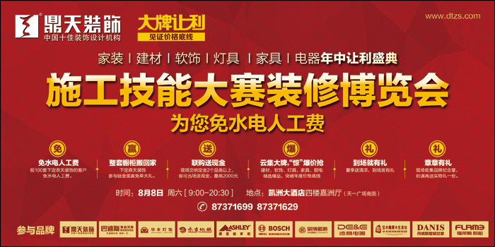 “借你的房子,秀一秀我們的技藝,來一場手藝人的大賽。”8月8日,鼎天裝飾在凱洲大酒店四樓嘉洲廳舉辦施工技能大賽裝修博覽會,現(xiàn)場限量征集“技能大賽”樣板房,開啟鼎天一年一度的技能大練兵活動。鼎天裝飾所有施工班組、設(shè)計師,都將挑戰(zhàn)最強手藝人稱號。如果你的房子正好要裝修,不妨加入到這場盛事,讓我們給你一個驚喜。 技能大賽,強者為王 “施工技能大賽房”活動由鼎天百余名高端設(shè)計師、金牌施工團隊參與,考量設(shè)計、施工、服務(wù)等技能,由公司管理高層實時監(jiān)理,結(jié)合業(yè)主反饋的信息和工地驗收情況,評出年度最優(yōu)施工團隊、最優(yōu)匠人?!凹寄艽筚悺睒影宸坎粌H是內(nèi)部團隊的榮譽之爭,更將參與爭奪?。ㄊ校﹥?yōu)秀裝飾工程(設(shè)計)獎項。據(jù)悉,榮獲寧波市、浙江省優(yōu)秀裝飾工程(設(shè)計)獎項的鼎天作品,許多來自“技能大賽”樣板房。 年中裝修瘋狂讓利,見證價格底線 裝修人工費日益高漲,如水電人工費,目前市場價格已漲至40至50元每平米。為慶活動,鼎天裝飾將對前100套樣板房業(yè)主推出免水電人工費特惠。以120平方米的房屋面積計算,業(yè)主將節(jié)省成本6000多元,住宅面積越大節(jié)省的成本越驚人。此外,重磅優(yōu)惠還在繼續(xù),到訪活動就有一份實物禮,現(xiàn)場集齊10枚紀念章還可再領(lǐng)取一份大賽集章禮?;顒赢斕鞈{鼎天裝飾定單,還可參與砸金蛋得免單大獎,將有機會贏取價值萬元的整套櫥柜免費帶回家,更有建材、家電、工程抵用款等各種免單大獎。每個金蛋都有禮,絕不讓您空砸。 同時,鼎天還聯(lián)合眾多一線建材品牌,推出聯(lián)盟建材年中讓利大惠全城。各品牌將拿出年度最高驚爆價。如果能趕上這樣的購物冰點時刻,即使大熱的天,也會讓你酷爽的透心涼。而且在享受購買聯(lián)盟建材年度最低的折扣上,繳納定金2個品類以上,活動當場還返現(xiàn)金,最高可返2000元。此次不搶今年不會再有?;顒又衅放平ú穆?lián)盟涵蓋瓷磚、地板、櫥柜、吊頂、窗簾、家具、廚電等眾多品類。 高達萬元的種種福利,不敢私藏!這絕對是年中裝修的最瘋狂讓利,隨時準備好搶定吧! 信仰品質(zhì),百余套在建工地現(xiàn)場品鑒 當然,本次活動更重要還在于暢聊裝修。鼎天至尊工作室設(shè)計團隊領(lǐng)銜壓場,一對一分享裝修構(gòu)思。業(yè)主還可參與“在裝工地體驗行”,實地踏訪百余套在建工地,領(lǐng)略品質(zhì)裝修。如:青林灣、世貿(mào)首府、鉑翠灣、海外灘、新外灘一號、中海國際社區(qū)、銘豪觀樾、維科上院、鈺鼎園、蘇園、印象外灘、星河國際、舒沁苑、君和院、銀億東岸、風(fēng)格尚品、盛世華府、金億文園、悅瀾灣、景瑞望府、君瀾上府、榮安心居、東海府、藏瓏、締壹城、君園和莊、山清軒、銀億上郡、文瀾水岸、左岸尚苑、金色江山、水榭花都、紫玉花園、麗江苑、君雅苑、金色瓏庭、東都華庭、宜家花園、晴園、麗景英郡、保利城、芳辰麗陽、英倫水岸、東湖觀邸、盛世天城、江南一品、雍城世家、上上城等甬城小區(qū)由您選擇。如此細致,只因信仰品質(zhì)。 整體家居,“三省”裝修方案搬回家 鼎天裝飾打造整體家居解決方案,滿足大眾裝修省心、省力、省錢的“三省”裝修需求。其優(yōu)勢在于,方案借鑒了大量優(yōu)秀裝修案例,洞悉人們的日常生活,最大化確保居住的舒適性和功能使用的合理性,是大團隊的整體智慧結(jié)晶。目前,鼎天裝飾成功推出的美艷1號、美艷5號、美艷8號及美艷999等精裝套餐,已在市場上取得了巨大成功,深受都市白領(lǐng)、經(jīng)典婚房及改善型裝修者的青睞。因為實行有效地資源整合,鼎天整體家居方案比常規(guī)裝修能節(jié)省費用400-500元/平方米。 特別預(yù)告: 8月8日(周六)9:00---20:30,鼎天裝飾在凱洲大酒店四樓嘉洲廳(天一廣場南面)舉辦“施工技能大賽裝修博覽會”,現(xiàn)場限量征集前100套“技能大賽”樣板房,為您免水電人工費,且由鼎天至尊工作室、金牌施工團隊聯(lián)手打造完美家裝樣板工程?,F(xiàn)場還尊享一站式家裝建材購齊服務(wù),高達萬元的種種福利,不敢私藏! 樣板房報名熱線:87371629 貴賓熱線:87371699
