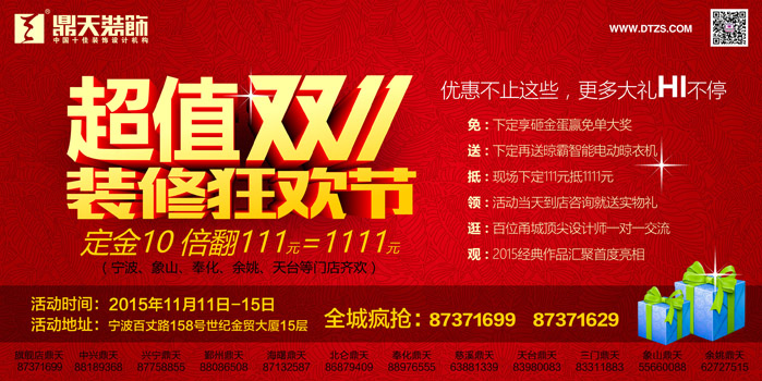 定金10倍翻 雙11來了,并且是來真的了!這是我們有史以來第1次,一年也只有1次,我們的“雙11”!不用秒殺,不用剁手,只需要111元就可以定裝修。 11月11日—15日鼎天裝飾特舉辦《裝修狂歡節(jié),超值雙11》裝修狂歡周活動,此次活動鼎天裝飾將在寧波城區(qū):總部旗艦店、鼎天海曙店、鼎天中興店、鼎天鄞州店、鼎天興寧店以及鼎天奉化、象山、余姚、天臺等門店同歡?;顒訒r間內(nèi),與鼎天下定就可以享受定金10倍翻的優(yōu)惠活動,下定111元=1111元,如此超值,一年僅一次,就在這一周!