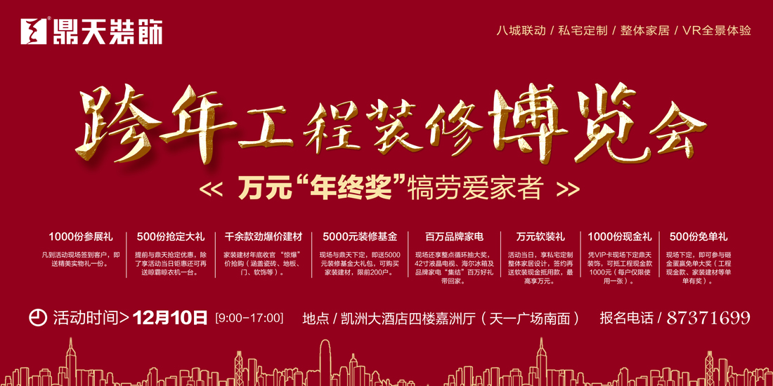 特別預(yù)告: 12月10日(周六)9:00-17:00,鼎天裝飾在凱洲大酒店四樓嘉州廳(天一廣場南面)舉辦“跨年裝修博覽會”,現(xiàn)場限量征集前200套“跨年工程”樣板房,悅享百萬裝修特惠,并由鼎天至尊工作室、金牌施工團隊聯(lián)手打造完美家裝樣板工程?,F(xiàn)場還尊享一站式家裝建材購齊服務(wù)。種種福利,心動不如行動! 樣板房報名熱線:87371629 貴賓熱線:87371699 |
