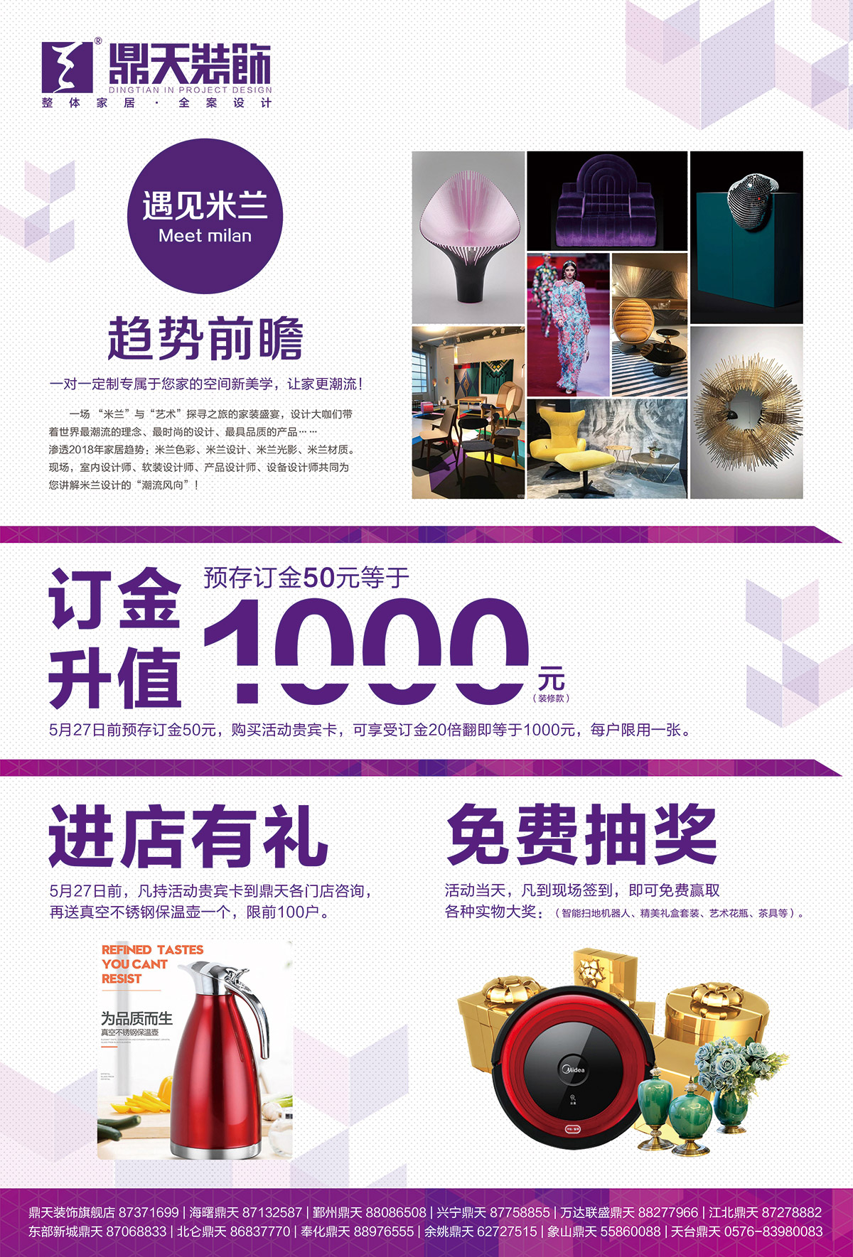 品牌創(chuàng)造美艷|裝修,我們是認(rèn)真的 美艷設(shè)計(jì)周,鼎天裝飾以精致服務(wù)款待客人。除了提供優(yōu)秀設(shè)計(jì)和施工品質(zhì),鼎天裝飾還外延了更多的服務(wù),以滿足客戶的不同需求:打造鼎天軟裝服務(wù)平臺(tái),實(shí)現(xiàn)硬裝、軟裝無(wú)縫銜接”,精裝房微改造服務(wù),解決精裝房業(yè)主的個(gè)性化需求等。 鼎天裝飾的工程項(xiàng)目遍及江灣城、銀泰城、風(fēng)格首岸、金地悅江來(lái)、宏泰風(fēng)花樹(shù)、公園1872、青林灣、公園世家、寰宇天下、美的蝴蝶海、世貿(mào)天慧、奧萊公園、江山萬(wàn)里、東海府、雅戈?duì)柮髦?、鉑悅府、龍湖名景臺(tái)、維科東院、印象巴黎、綠地海外灘、風(fēng)格尚品、東方一品、維科馨院、蘇園、印象外灘、景瑞望府、締壹城、榮安心居、保利城等甬城眾多小區(qū),活動(dòng)中,歡迎到場(chǎng)的客人們品鑒其中的經(jīng)典裝修案例?;顒?dòng)還將安排客戶實(shí)地踏訪在建工地,深入工地現(xiàn)場(chǎng)了解施工品質(zhì)。