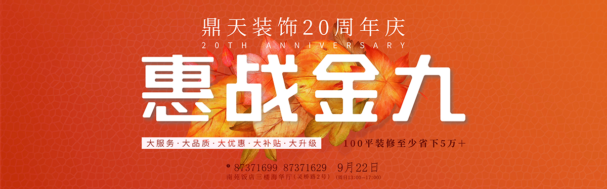 特別預告: 9月22日(周日)13:00-17:00,鼎天裝飾將在南苑飯店三樓海華廳(靈橋路2號)舉辦“20周年慶”活動,現(xiàn)場征集前60套成本價樣板房,悅享萬元豪華禮包。鼎天至尊工作室、金牌施工團隊聯(lián)手打造完美家裝樣板工程?,F(xiàn)場尊享一站式家裝建材購齊服務(wù)。 樣板房報名熱線:87371629 貴賓熱線:87371699 |
