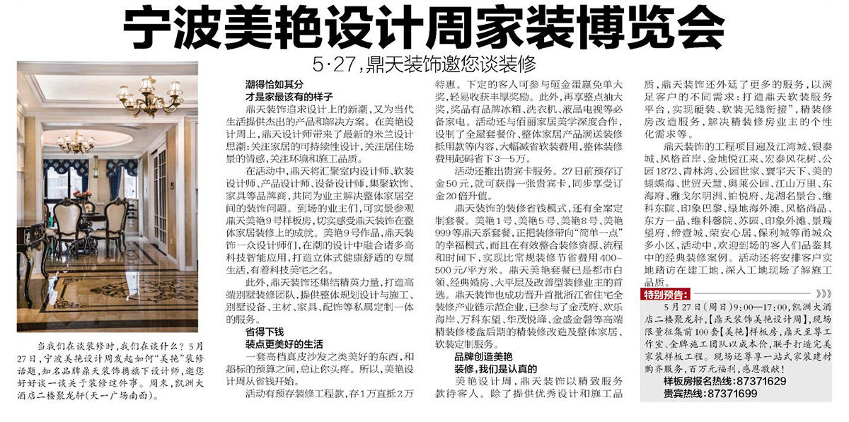寧波美艷設(shè)計周,為當(dāng)下生活提供杰出的家居產(chǎn)品和裝飾解決方案。本周末,鼎天裝飾匯聚室內(nèi)設(shè)計師、軟裝設(shè)計師、產(chǎn)品設(shè)計師等大咖,從空間規(guī)劃,到軟飾搭配,到家具定制,為業(yè)主全方位設(shè)計當(dāng)潮時尚生活空間。 一切美好,從省錢開始 在美艷設(shè)計周,省下錢,成就時尚裝修?;顒忧埃?7日前),到鼎天預(yù)存50元訂金,就可收獲貴賓卡一張,享受訂金20倍升值?;顒赢?dāng)天,預(yù)存裝修工程款,存1萬抵2萬; 下定還享有砸金蛋贏免單大獎和整點抽大獎機(jī)會,有品牌冰箱、洗衣機(jī)、液晶電視等豐厚獎品恭候?;顒舆€與佰麗家居美學(xué)深度合作,推出全屋家具套餐價、整體家居產(chǎn)品滿送裝修抵用款等內(nèi)容,整體裝修費用起碼省下3—5萬。 鼎天裝飾的裝修省錢模式,還有全案定制套餐。美艷1號、美艷5號、美艷8號、美艷999等鼎天系套餐,正把裝修帶向“簡單一點”的幸福模式,而且在有效整合裝修資源、流程和時間下,實現(xiàn)比常規(guī)裝修節(jié)省費用400-500元/平方米。鼎天美艷套餐已是都市白領(lǐng)、經(jīng)典婚房、大平層及改善型裝修業(yè)主的首選。鼎天裝飾也成功晉升首批浙江省住宅全裝修產(chǎn)業(yè)鏈?zhǔn)痉镀髽I(yè),已參與了金茂府、歡樂海岸、萬科東望、華茂悅峰、金盛金磐等高端精裝修樓盤后期的精裝修改造及整體家居、軟裝定制服務(wù)。 精致服務(wù),從整裝開始 美艷設(shè)計周,鼎天裝飾以精致服務(wù)款待客人。除了提供優(yōu)秀設(shè)計和施工品質(zhì),鼎天裝飾還外延了更多的功能服務(wù),以滿足客戶的不同需求:打造整體家居服務(wù)平臺,實現(xiàn)硬軟裝的無縫銜接;提供整體家具、軟裝定制等服務(wù),給予客戶更貼身和審美的產(chǎn)品;推出精裝修房改造服務(wù),解決精裝修房業(yè)主的個性化需求等等。 在美艷設(shè)計周,鼎天裝飾還為客戶整理江灣城、銀泰城、風(fēng)格首岸、金地悅江來、宏泰風(fēng)花樹、公園1872、青林灣、公園世家、寰宇天下、美的蝴蝶海、奧萊公園、江山萬里、雅戈爾明洲、維科東院、印象巴黎、綠地海外灘、風(fēng)格尚品、東方一品、維科馨院、蘇園、印象外灘、景瑞望府、締壹城、榮安心居、保利城等甬城眾多小區(qū)的經(jīng)典裝修案例,以供鑒賞;并安排客戶實地踏訪在建工地,深入工地現(xiàn)場了解施工品質(zhì)。 5月27日,美艷裝修,從設(shè)計出發(fā),從服務(wù)深化。 特別預(yù)告: 5月27日(周日)9:00---17:00,凱洲大酒店二樓聚龍軒,【鼎天裝飾美艷設(shè)計周】,現(xiàn)場限量征集前100套【美艷】樣板房,鼎天至尊工作室、金牌施工團(tuán)隊以成本價,聯(lián)手打造完美家裝樣板工程?,F(xiàn)場還尊享一站式家裝建材購齊服務(wù),百萬元福利,感恩敬獻(xiàn)! 樣板房報名熱線:87371629 貴賓熱線:87371699 摘自2018年5月25日 寧波晚報 |