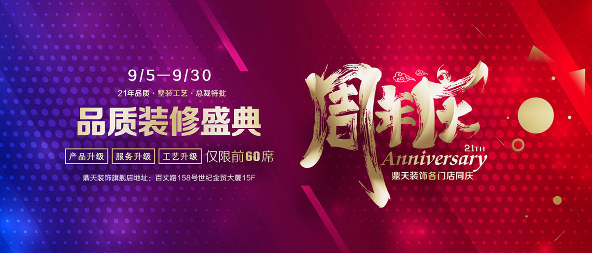 特別預(yù)告:9月5日—9月30日,鼎天裝飾【21周年慶】活動(dòng)在鼎天各大門(mén)店舉辦,活動(dòng)期間到店既享好禮。21年品質(zhì)●墅裝工藝●八大福利,鼎天至尊工作室、金牌施工團(tuán)隊(duì)聯(lián)手打造五星級(jí)樣板工程。 鼎天旗艦店地址:百丈路158號(hào)世紀(jì)金貿(mào)大廈15層 報(bào)名熱線(xiàn):87371629 貴賓熱線(xiàn):87371699 |