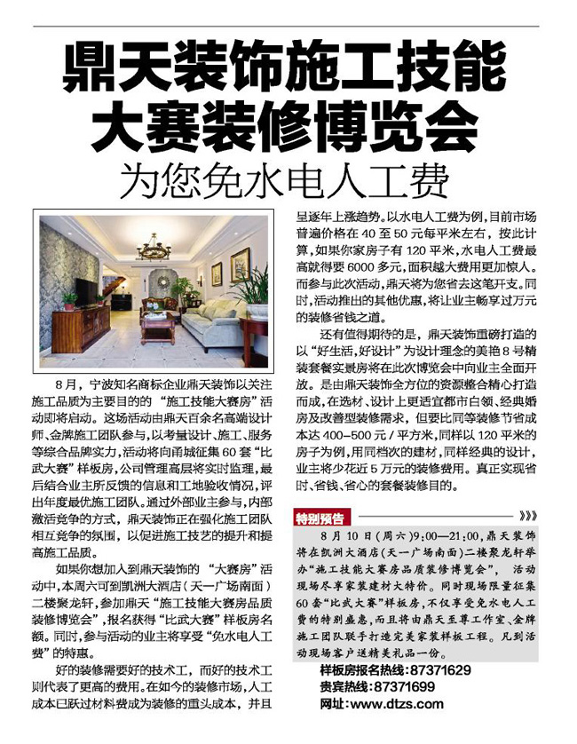 8月,寧波知名商標企業(yè)鼎天裝飾以關(guān)注施工品質(zhì)為主要目的的“施工技能大賽房”活動即將啟動。這場活動由鼎天百余名高端設(shè)計師、金牌施工團隊參與,以考量設(shè)計、施工、服務(wù)等綜合品牌實力,活動將向甬城征集60套“比武大賽”樣板房,公司管理高層將實時監(jiān)理,最后結(jié)合業(yè)主所反饋的信息和工地驗收情況,評出年度最優(yōu)施工團隊。通過外部業(yè)主參與,內(nèi)部激活競爭的方式,鼎天裝飾正在強化施工團隊相互競爭的氛圍,以促進施工技藝的提升和提高施工品質(zhì)。 如果你想加入到鼎天裝飾的“大賽房”活動中,本周六可到凱洲大酒店(天一廣場南面)二樓聚龍軒,參加鼎天“施工技能大賽房品質(zhì)裝修博覽會”,報名獲得“比武大賽”樣板房名額。同時,參與活動的業(yè)主將享受“免水電人工費”的特惠。 好的裝修需要好的技術(shù)工,而好的技術(shù)工則代表了更高的費用。在如今的裝修市場,人工成本已躍過材料費成為裝修的重頭成本,并且呈逐年上漲趨勢。以水電人工費為例,目前市場普遍價格在40至50元每平米左右,按此計算,如果你家房子有120平米,水電人工費最高就得要6000多元,面積越大費用更加驚人。而參與此次活動,鼎天將為您省去這筆開支。同時,活動推出的其他優(yōu)惠,將讓業(yè)主暢享過萬元的裝修省錢之道。 還有值得期待的是,鼎天裝飾重磅打造的以“好生活,好設(shè)計”為設(shè)計理念的美艷8號精裝套餐實景房,將在此次博覽會中向業(yè)主全面開放。美艷8號精裝套餐是由鼎天裝飾全方位的資源整合精心打造而成,在選材、設(shè)計上更適宜都市白領(lǐng)、經(jīng)典婚房及改善型裝修需求,但要比同等裝修節(jié)省成本達400-500元/平方米,同樣以120平米的房子為例,用同檔次的建材,同樣經(jīng)典的設(shè)計,業(yè)主將少花近5萬元的裝修費用。真正實現(xiàn)省時、省錢、省心的套餐裝修目的。 特別預(yù)告: 8月10日(周六)9:00---21:00,鼎天裝飾將在凱洲大酒店(天一廣場南面)二樓聚龍軒舉辦“施工技能大賽房品質(zhì)裝修博覽會”, 活動現(xiàn)場盡享家裝建材大特價。同時現(xiàn)場限量征集60套“比武大賽”樣板房,不僅享受免水電人工費的特別盛惠,而且將由鼎天至尊工作室、金牌施工團隊聯(lián)手打造完美家裝樣板工程。凡到活動現(xiàn)場客戶送精美禮品一份。 樣板房報名熱線:87371629 貴賓熱線:87371699 鼎天新浪微博:@鼎天裝飾