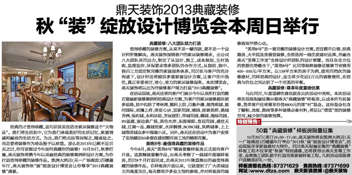 今年8月份,鼎天“美艷8號(hào)”精裝套餐樣板房正式面向客戶開(kāi)放。這款精裝套餐作品,由鼎天考察了一線城市高端樣板房,歷時(shí)8個(gè)月打造完成,是鼎天2013年隆重推出的最值得典藏的裝修作品。自樣板房開(kāi)放以來(lái),它就受到了廣大甬城業(yè)主的高度關(guān)注,每天都有許多業(yè)主預(yù)約參觀,并對(duì)樣板房的裝修效果怦然心動(dòng)。而這款經(jīng)典的作品,因全方位的資源整合優(yōu)勢(shì),比同等規(guī)格裝修節(jié)省費(fèi)用400-500元/平方米。以138平方米的房子為例,使用同檔次的裝修建材,同樣經(jīng)典的設(shè)計(jì),業(yè)主將少花近5萬(wàn)元的裝修費(fèi)用,在經(jīng)典與價(jià)位之間達(dá)到了一個(gè)完美的平衡。 所謂經(jīng)典的才值得珍藏,這句話其實(shí)也完全適合家居裝修這個(gè)“空間藝術(shù)品”。所有業(yè)主都會(huì)希望自己的家居裝修空間也能是一個(gè)經(jīng)典,值得我們珍藏。那么在2013年已剩不足百天之時(shí),你可曾想過(guò)今年如何典藏你的裝修?10月20日(本周日),秋季爛漫,鼎天裝飾將攜今年以來(lái)最經(jīng)典的裝修案例和設(shè)計(jì)方案,為你打造值得珍藏的裝修作品。凱洲大酒店(天一廣場(chǎng)南面)四樓嘉年廳,鼎天裝飾秋“裝”綻放設(shè)計(jì)博覽會(huì)讓你尊享“2013典藏裝修”盛宴。 圍繞客戶的家居裝修需求,鼎天裝飾八大團(tuán)隊(duì)共同出力,制定了從設(shè)計(jì)、施工、成本規(guī)劃、主材選購(gòu)、監(jiān)理監(jiān)控、環(huán)保要求等多團(tuán)隊(duì)的合作方式,從售前、售中、售后三方面定制完整的家裝服務(wù)體系,同時(shí)在與客戶的充分溝通下,設(shè)計(jì)師還將提供多套家裝設(shè)計(jì)方案,讓客戶優(yōu)中選優(yōu),真正享受省時(shí)、省心、省力的家居裝修服務(wù)。本次博覽會(huì),鼎天裝飾將以此為待裝修客戶傾力打造“2013典藏裝修”。 與此同時(shí),年度重磅優(yōu)惠也就在此次活動(dòng)中亮相,簽單客戶還將尊享價(jià)值8800元的理“材”基金。這份基金包含了櫥柜、地板、瓷磚等多種裝修必備材料,將足以“增值”您的裝修空間,減少您的裝修預(yù)算。 特別預(yù)告: 鼎天裝飾秋“裝”綻放設(shè)計(jì)博覽會(huì) 50套“典藏裝修”樣板房限量征集 10月 20日(周日)9:00---17:00,鼎天裝飾將在凱洲大酒店(天一廣場(chǎng)南面)四樓嘉年廳舉辦“2013秋‘裝’綻放設(shè)計(jì)博覽會(huì)”,活動(dòng)現(xiàn)場(chǎng)盡享家裝建材大特價(jià)。同時(shí)鼎天“典藏裝修”樣板工程不僅享受“秋裝”特別盛惠,還將獲得由鼎天至尊工作室、金牌施工團(tuán)隊(duì)聯(lián)手打造完美家裝樣板工程。凡到活動(dòng)現(xiàn)場(chǎng)客戶送精美好禮一份。 樣板房報(bào)名熱線:87371629 貴賓熱線:87371699 鼎天新浪微博:@鼎天裝飾 摘自2013年10月18日 寧波晚報(bào) |