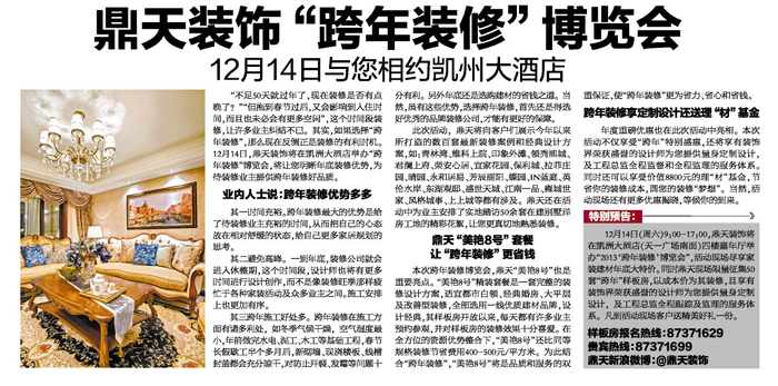 進(jìn)擊年底裝修盛會(huì),讓裝修在新春前就動(dòng)起來,鼎天裝飾“跨年裝修”給你8大理由。其一,享受更優(yōu)質(zhì)的設(shè)計(jì)師資源。到了年底,裝修公司的設(shè)計(jì)師們會(huì)處于相對(duì)放松的狀態(tài),他們會(huì)有更多時(shí)間與客戶溝通交流和創(chuàng)作設(shè)計(jì)方案,而不是像裝修旺季那樣疲于眾多活動(dòng)及各位業(yè)主之間。如同本次鼎天裝飾“跨年裝修”博覽會(huì),鼎天“至尊工作室”的精英設(shè)計(jì)團(tuán)隊(duì)將悉數(shù)到場(chǎng),為跨年裝修客戶提供最優(yōu)質(zhì)的設(shè)計(jì)服務(wù)。 其二,“跨年裝修”業(yè)主在建材選購上可以擁有更寬裕的時(shí)間,而且年底買建材,還可歸避新年之后通常到來的建材漲價(jià)潮,同時(shí)年底作為建材商們沖銷量的收官時(shí)間,往往會(huì)有更多折扣優(yōu)惠,業(yè)主們正可趁此機(jī)會(huì)到建材市場(chǎng)“淘淘寶”。本次博覽會(huì),鼎天裝飾也聯(lián)合了眾多一線建材品牌。 其三,對(duì)裝修質(zhì)量更有保證。比如房屋框架改造中,現(xiàn)澆樓板、新建墻體等工序,在春節(jié)期間進(jìn)行充分晾干,對(duì)防止開裂、發(fā)霉等問題十分有利等。本次跨年裝修博覽會(huì),鼎天“美艷8號(hào)”也是重要亮點(diǎn)。“美艷8號(hào)”精裝套餐是一套完整的裝修設(shè)計(jì)方案,適宜都市白領(lǐng)、經(jīng)典婚房、大平層及改善型裝修,全部選用一線優(yōu)質(zhì)建材品牌,設(shè)計(jì)經(jīng)典,其樣板房開放以來,每天都有許多業(yè)主預(yù)約參觀,并對(duì)樣板房的裝修效果十分喜愛。而且在全方位的資源優(yōu)勢(shì)整合下,“美艷8號(hào)”比同等規(guī)格裝修還能夠節(jié)省費(fèi)用400-500元/平方米。結(jié)合“跨年裝修”,“美艷8號(hào)”將是品質(zhì)和服務(wù)的雙重保證,使“跨年裝修”更為省力、省心、省錢。 特別預(yù)告: 12月 14日(周六)9:00---17:00,鼎天裝飾將在凱洲大酒店(天一廣場(chǎng)南面)四樓嘉年廳舉辦“2013“跨年”裝修博覽會(huì)”,活動(dòng)現(xiàn)場(chǎng)盡享家裝建材年底大特價(jià)。同時(shí)鼎天現(xiàn)場(chǎng)限量征集50套“跨年”樣板房,以成本價(jià)為其裝修,且享有裝飾界榮獲盛譽(yù)的設(shè)計(jì)師為您提供量身定制設(shè)計(jì),及工程總監(jiān)全程跟蹤及監(jiān)理的服務(wù)體系。凡到活動(dòng)現(xiàn)場(chǎng)客戶送精美好禮一份。 樣板房報(bào)名熱線:87371629 貴賓熱線:87371699 鼎天新浪微博:@鼎天裝飾