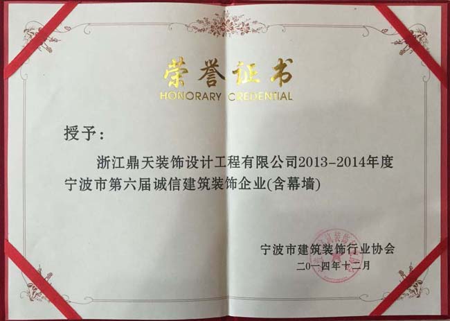 根據(jù)《寧波市建筑裝飾行業(yè)協(xié)會(huì)關(guān)于舉辦2013-2014年度寧波市第六屆誠(chéng)信建筑裝飾企業(yè)評(píng)選活動(dòng)的通知》經(jīng)寧波市建筑裝飾行業(yè)協(xié)會(huì)公開(kāi)、公平、公正的原則,將“寧波市第六屆誠(chéng)信建筑裝飾企業(yè)”頒發(fā)于《浙江鼎天裝飾設(shè)計(jì)工程有限公司》。 鼎天裝飾一直以來(lái)秉持“誠(chéng)實(shí)守信,客戶為先”的信念,已擁有深厚的品牌底蘊(yùn)!鼎天在設(shè)計(jì)、施工、服務(wù)上更是追求極致的精神,讓其在消費(fèi)者心目中的形象與口碑極為良好。這讓鼎天裝飾成為裝飾行業(yè)的佼佼者,同時(shí)也獲得了消費(fèi)者跟同行業(yè)的高度認(rèn)可!