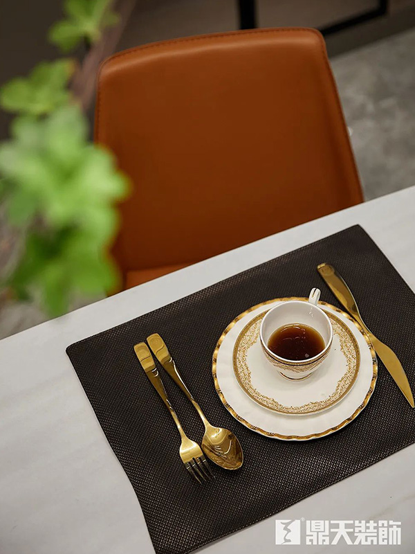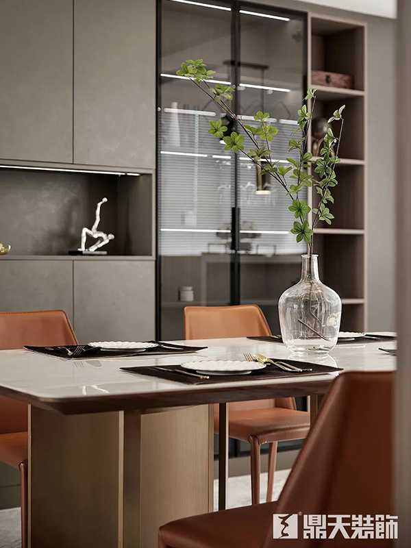 PART02 餐廳 餐廳延續(xù)了客廳的灰色調(diào)的大理石瓷磚,色調(diào)一致,視覺上讓業(yè)主用餐心境更為寧和。餐桌的搭配大大提升了空間的品質(zhì)感與精致度。