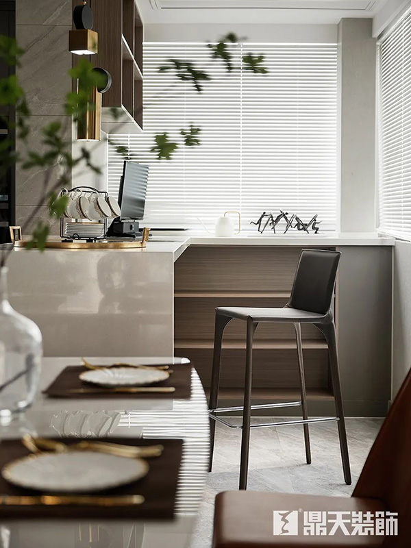 PART04 休閑吧 業(yè)主是一位居家辦公人士,因此工作區(qū)域又是休閑區(qū)域,直角窗戶的設(shè)計加一個吧臺既能當書桌,也能在閑暇之余坐在這喝喝茶、看看風景,都是一件很愜意的事。