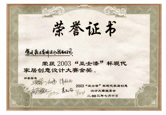 2003年07月 榮獲寧波市"亞漆杯"室內裝飾設計大賽金獎