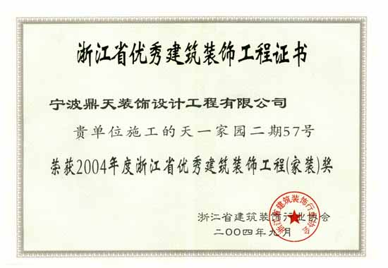 2004年09月 榮獲2004年度浙江省優(yōu)秀建筑裝飾工程(家裝)獎(二項)