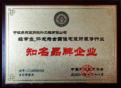 為了促進(jìn)全國(guó)裝飾裝修行業(yè)健康,有序,又好又快地可持續(xù)發(fā)展,推進(jìn)行業(yè)的不斷進(jìn)步,表彰先進(jìn),2008改革開(kāi)放三十周年全國(guó)裝飾裝修行業(yè)總結(jié)表彰大會(huì)評(píng)定:寧波鼎天裝飾設(shè)計(jì)工程有限公司 為全國(guó)裝飾行業(yè)知名品牌企業(yè).