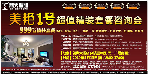 5月15 日(周六)9:00---17:00,鼎天裝飾將在凱洲大酒店(天一廣場南面)四樓嘉年廳舉辦鼎天“美艷1號”999元/㎡超值精裝套餐業(yè)主咨詢會和優(yōu)秀家裝作品圖片展,到活動現(xiàn)場盡享家裝建材大特價。