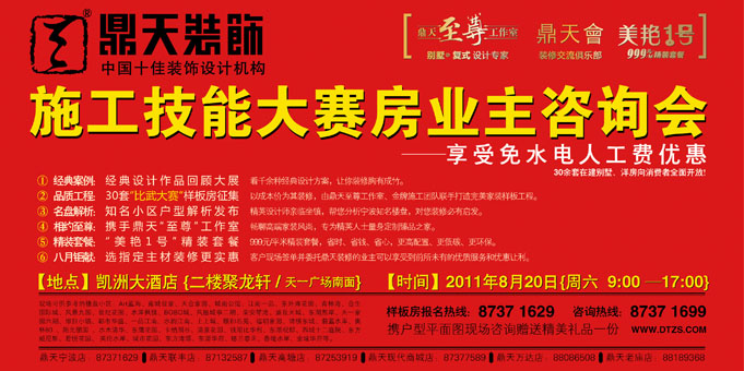 8月20 日(周六)9:00---17:00,鼎天裝飾將在凱洲大酒店(天一廣場南面)二樓聚龍軒舉辦鼎天裝飾施工技能大賽房業(yè)主咨詢會和優(yōu)秀家裝作品圖片展,到活動現(xiàn)場盡享家裝建材大特價。