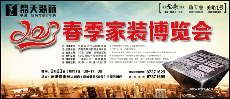2月 23日(周六)9:00---17:00,鼎天裝飾將在東港喜來登大酒店(彩虹北路50號)三樓五洲廳舉辦“2013春季家裝博覽會”,活動現(xiàn)場盡享家裝建材限時搶購超低價。同時鼎天“新春”樣板工程不僅享受新春特別盛惠,還將獲得由鼎天至尊工作室、金牌施工團隊聯(lián)手打造完美家裝樣板工程。凡到活動現(xiàn)場客戶送新春好禮一份