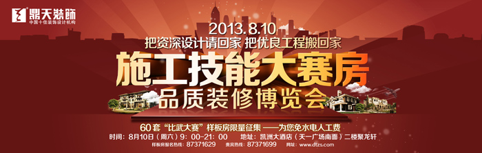 如果你想加入到鼎天裝飾的“大賽房”活動(dòng)中,8月10日可到凱洲大酒店(天一廣場(chǎng)南面)二樓聚龍軒,參加鼎天“施工技能大賽房品質(zhì)裝修博覽會(huì)”,報(bào)名獲得“比武大賽”樣板房名額。